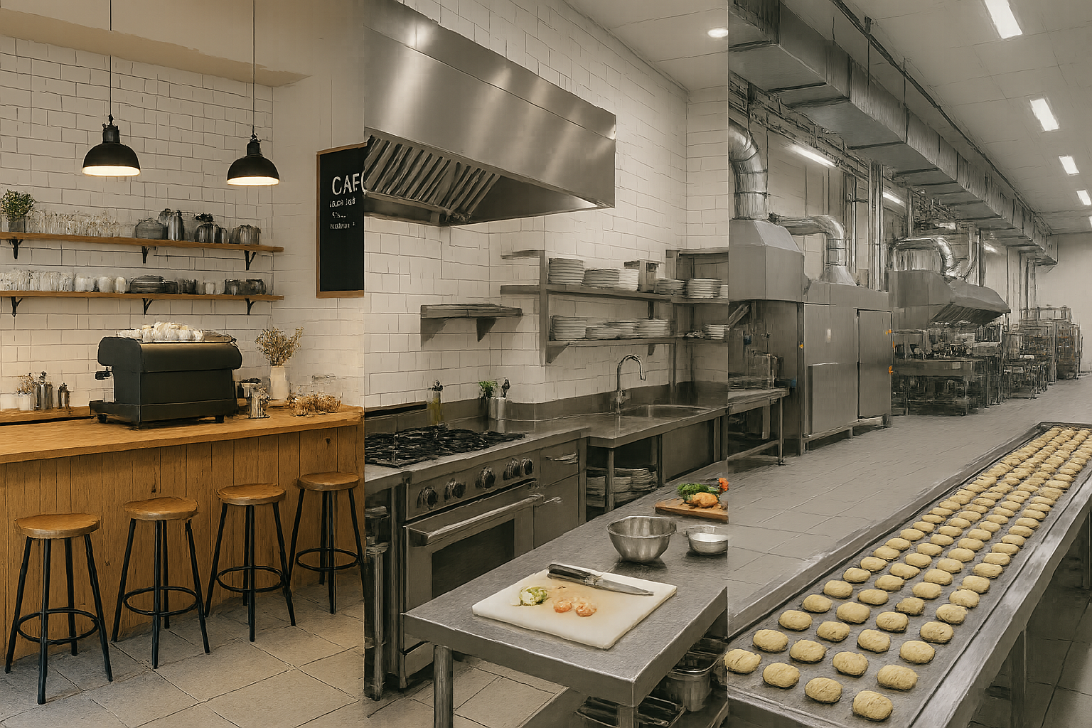 Производственные участки — местные отсосы и общеобмен, короба, зонты и рукава; работы по монтажу вентиляции с учётом технологических выбросов.